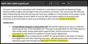 Back in August 2023, when the quasi-governmental entity Wyoming Energy Authority (WEA) was barely one year old, BWXT Advanced Technologies received $9,999,802 in Governor’s Energy Matching Funds (GEMF) for a project entitled: Assessment of Microreactor Deployment, Applications and Development of Nuclear Microreactor Technologies and Knowhow in the State of Wyoming.