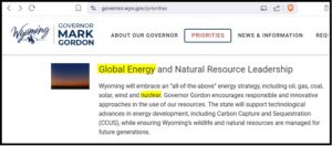 | May 8, 2023 Press Release: Wyoming Governor Gordon Highlights State’s Energy Leadership From Coal to Nuclear and Carbon Capture (https://governor.wyo.gov/news-releases/wyoming-governor-gordon-highlights-state-s-energy-leadership-from-coal-to-nuclear-and-carbon-capture) |